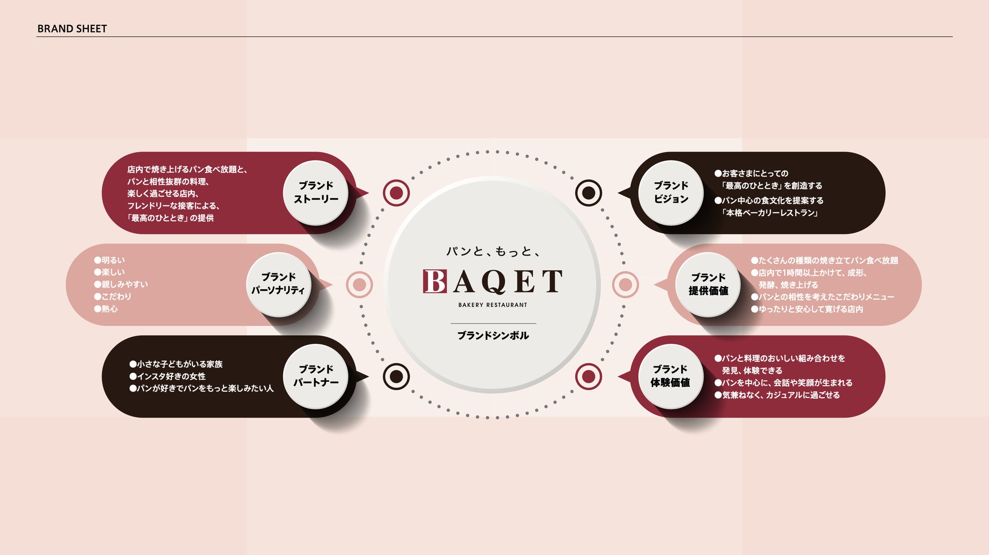 「ベーカリーレストラン バケット」のタグライン・ステートメントを記したブランドイメージ。