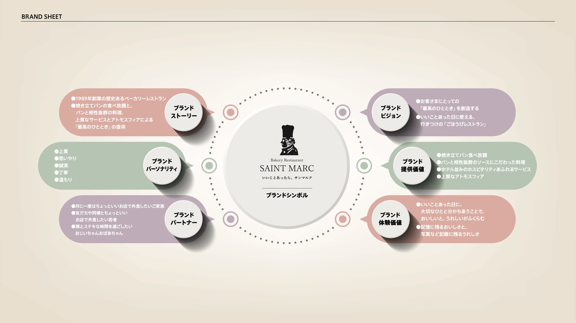 「ベーカリーレストラン サンマルク」のタグライン・ステートメントを記したブランドイメージ。
