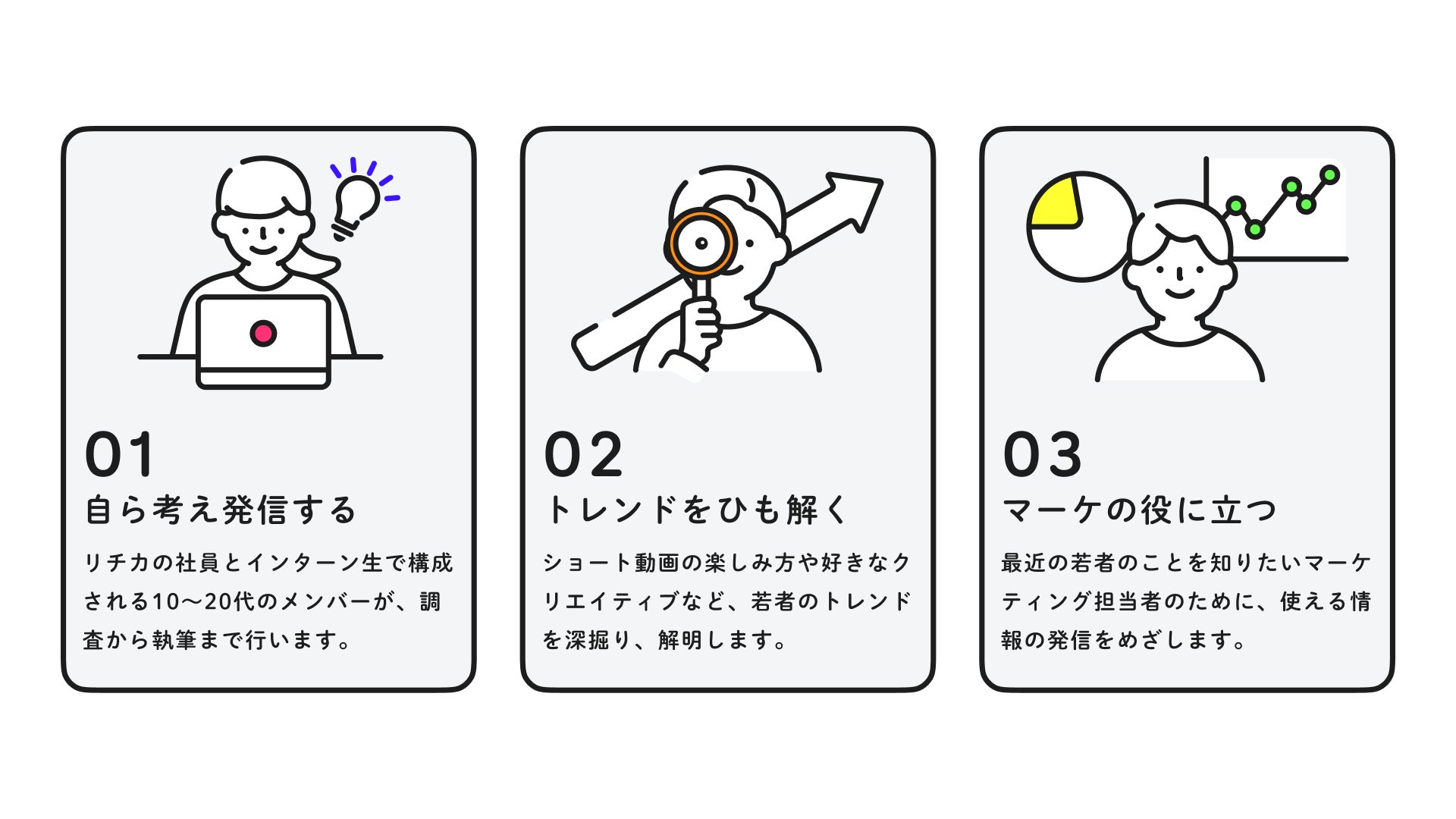 当社の『最近の若者研究所』は、若者ひとりひとりと向き合うマーケティング機関として設立しました。最近の若者はホントにいろんな価値観があって、世代でひと括りにすることなんてなかなか難しいと考えています。そのため、近年需要が高まっているショート動画を通じて、10代〜20代自らが最近の若者のホンネを引き出し、最新のトレンドや情報・価値観を調査していきます。「最近の若者研究所(わかけん)」は、動画をはじめとするクリエイティブに強みを持つリチカのマーケティング機関として、たくさんの企業のお客さまの「知りたい」「試したい」をベースに、お客さまに本当に役に立つ情報の発信をめざしていきます。