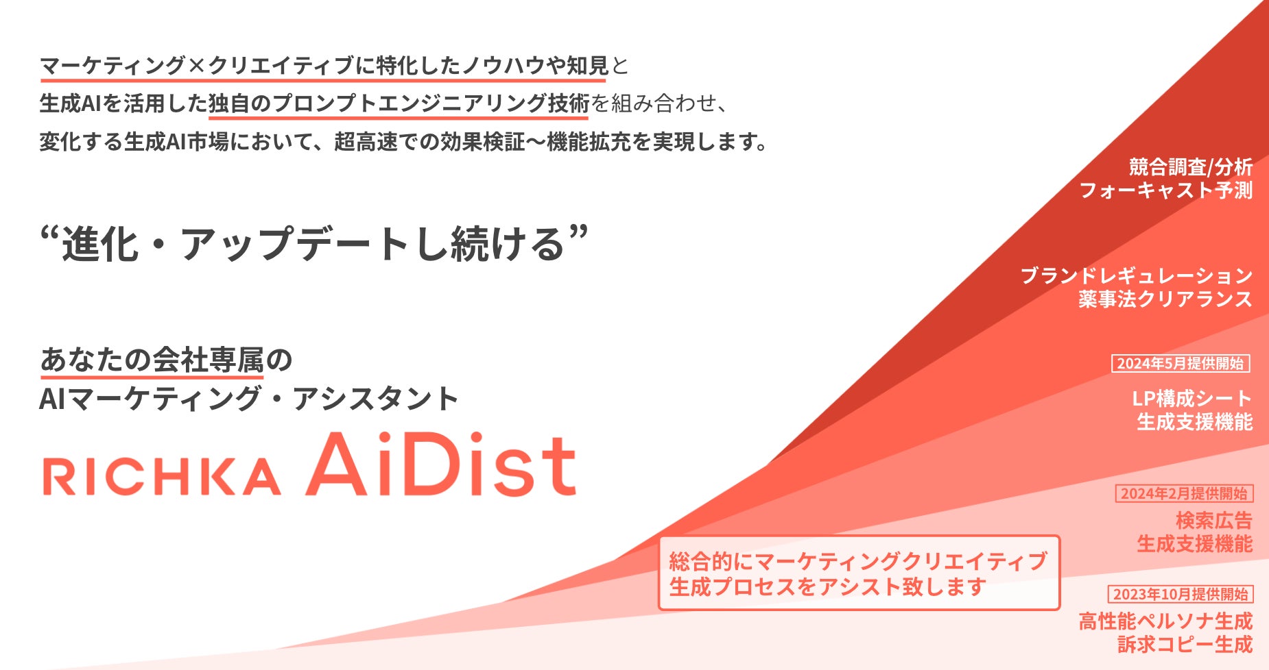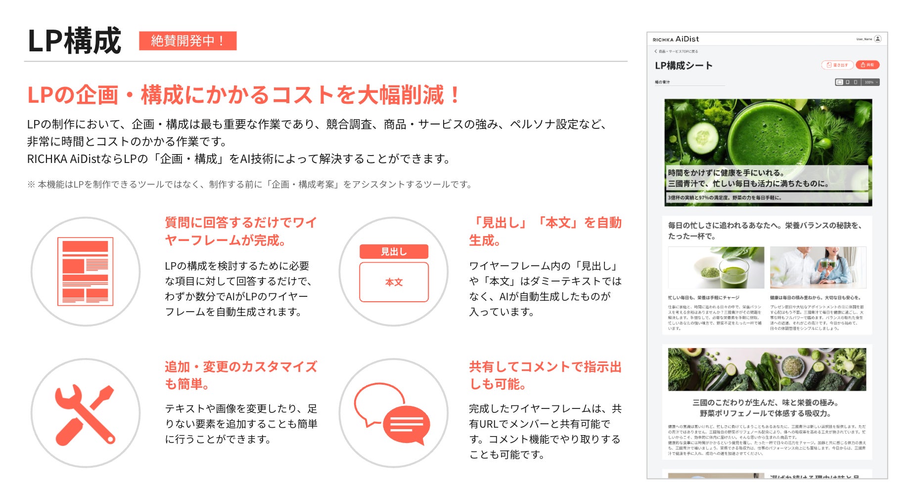 株式会社リチカ(本社:東京都渋谷区 / 代表取締役:松尾幸治 / 以下、当社)は、AIマーケティング・アシスタント「RICHKA AiDist(リチカ アイディスト)」の新機能として、商品情報を入力するだけでLPの構成シートを瞬時に出力できる『LP構成出力機能』を開発中です。現在はクローズドβ版として社内で活用しており、本リリースに向け開発を強化しています。
