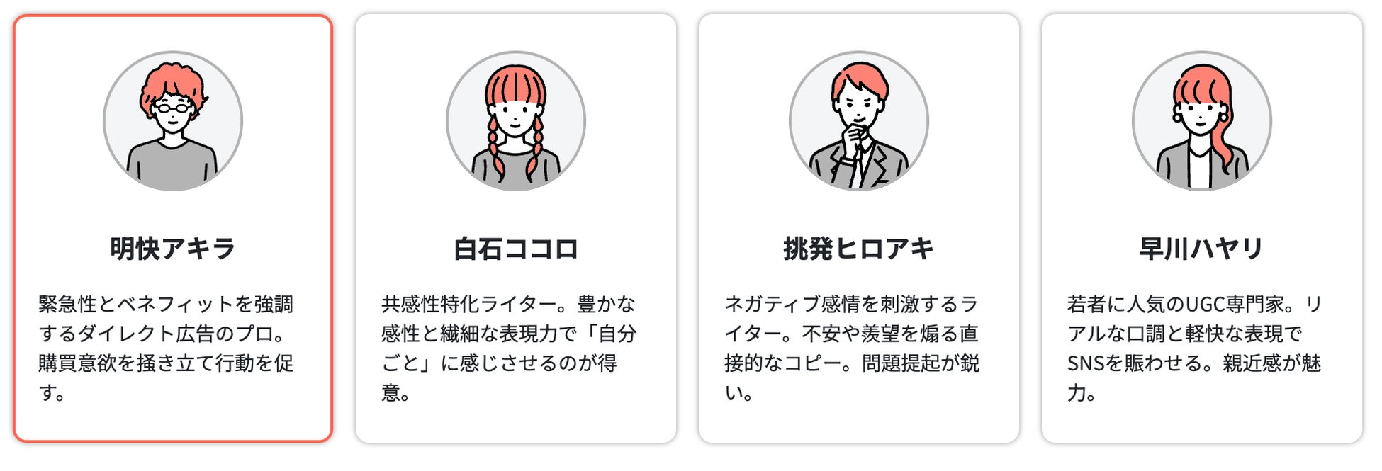 「AIコピーライター機能」はキャッチコピーを出力する前に得意分野が異なる複数のAIコピーライターから選ぶだけで、希望のトンマナでキャッチコピーを出力できます。初期は4人のAIコピーライターを用意しています。